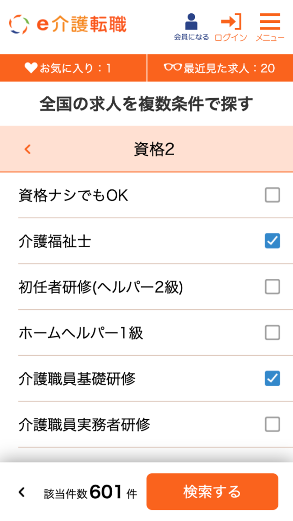 資格を選択すると、介護、看護、障害福祉に関する資格が一覧で出てきます。資格の選択は複数可能ですので、該当する資格を選択ください。