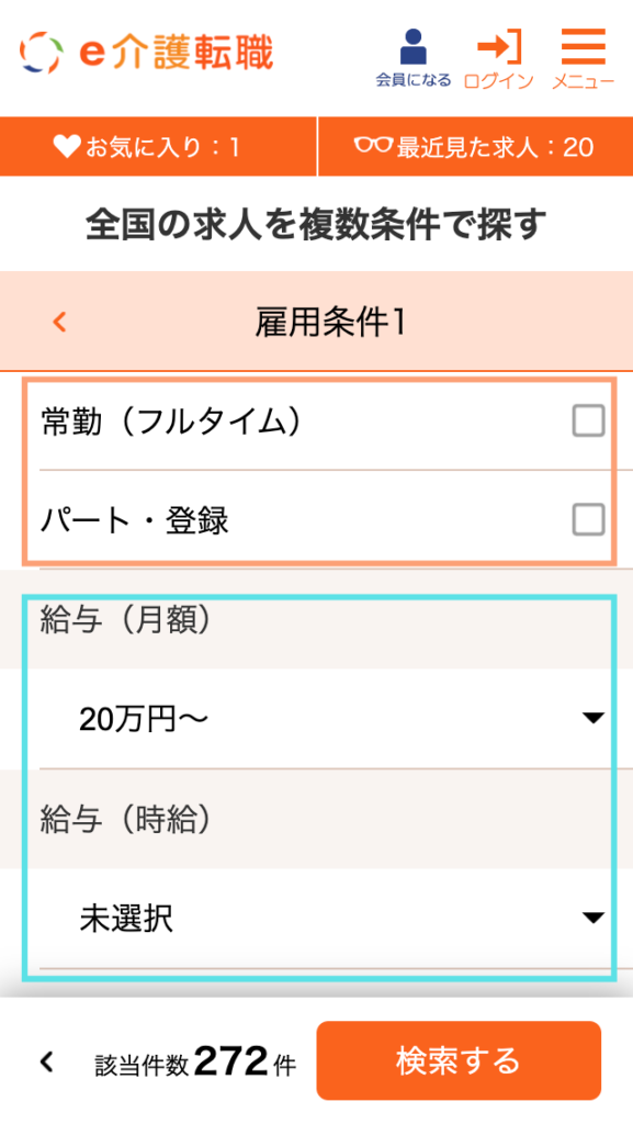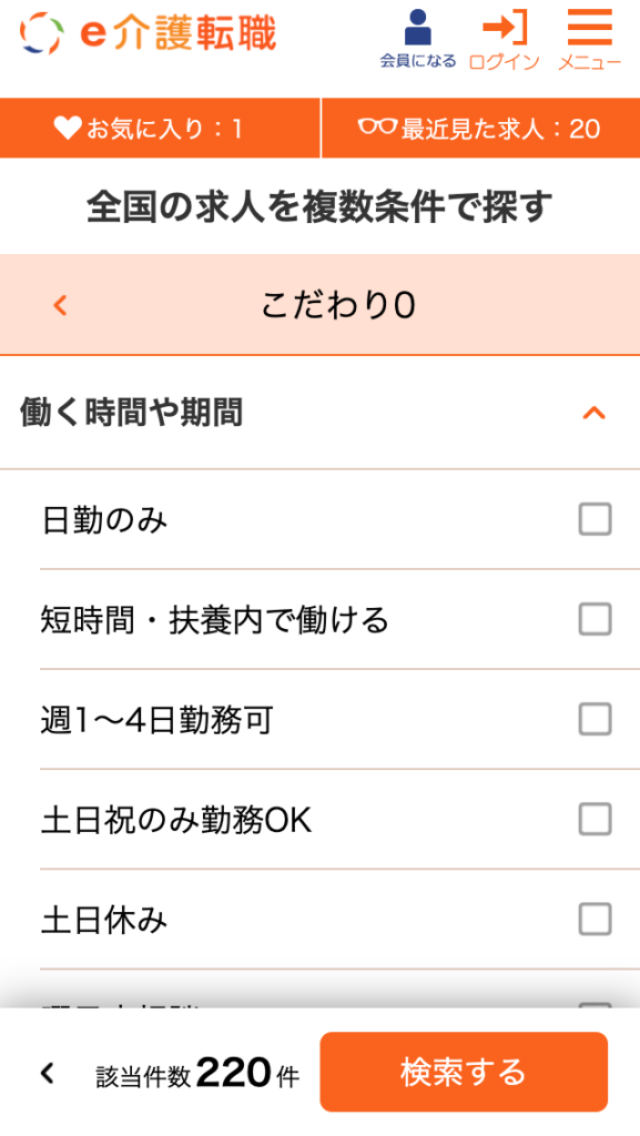 e介護転職では、「勤務地域」「保有資格」「雇用形態」「給与」「職種」といった基本条件だけでなく、こだわり条件からも細かく求人を絞り込むことができます。