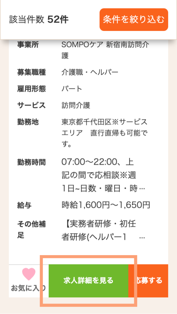 求人一覧ページに遷移後、気になる求人が見つかった場合は、「求人詳細を見る」をクリック頂くとより詳細な求人情報を見ることができます。