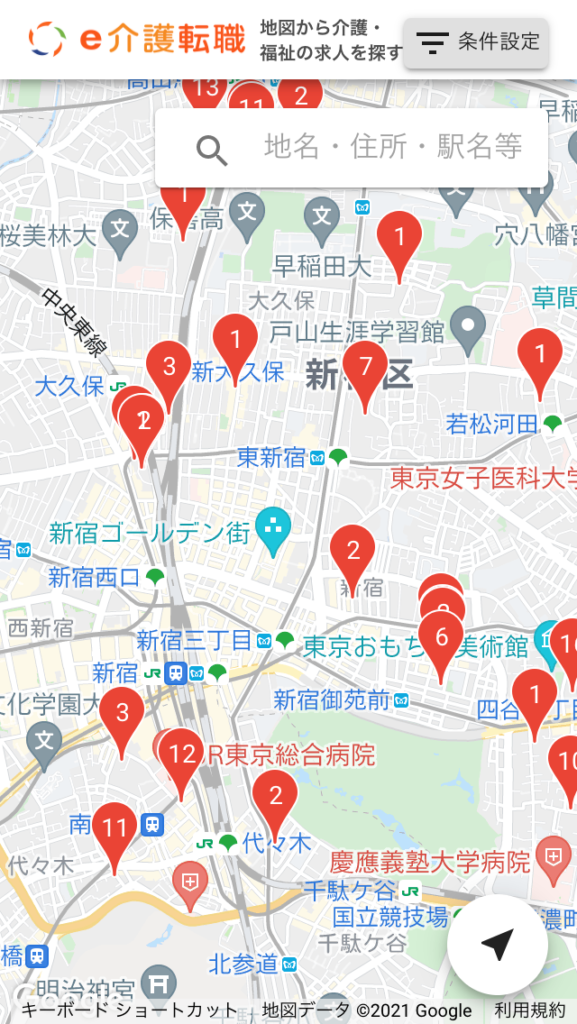 e介護転職では、地図から検索という機能があります。現在地や指定した地域から求人を検索することができます。