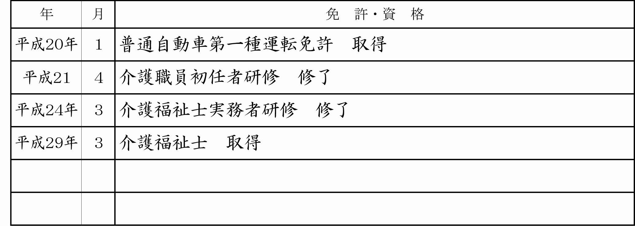 また、免許や資格の名称は、「初任者研修」という一般的な呼び方を書くのではなく、「介護職員初任者研修」というように正式名称で記載しましょう。