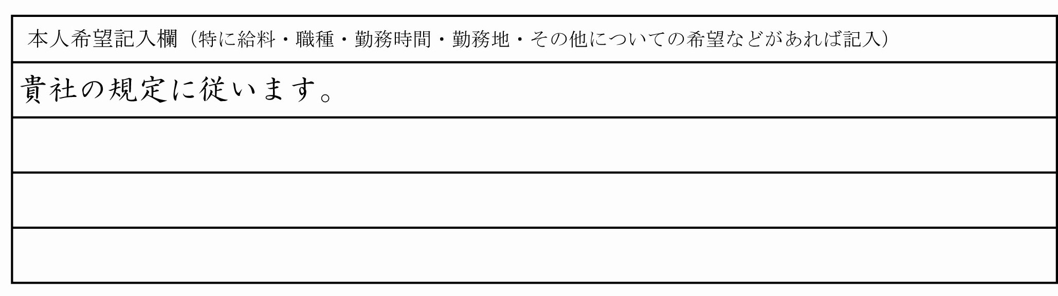 | 家庭の事情や自身の体調面で予め考慮してほしい内容は記載しても構わない | 「保育園に通う子どもを迎えに行くため、夕方17時には退勤させて頂けますと幸いです。」