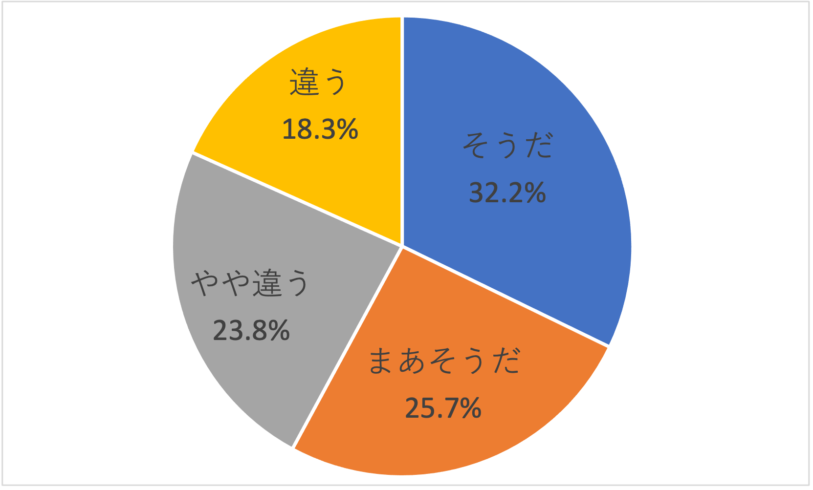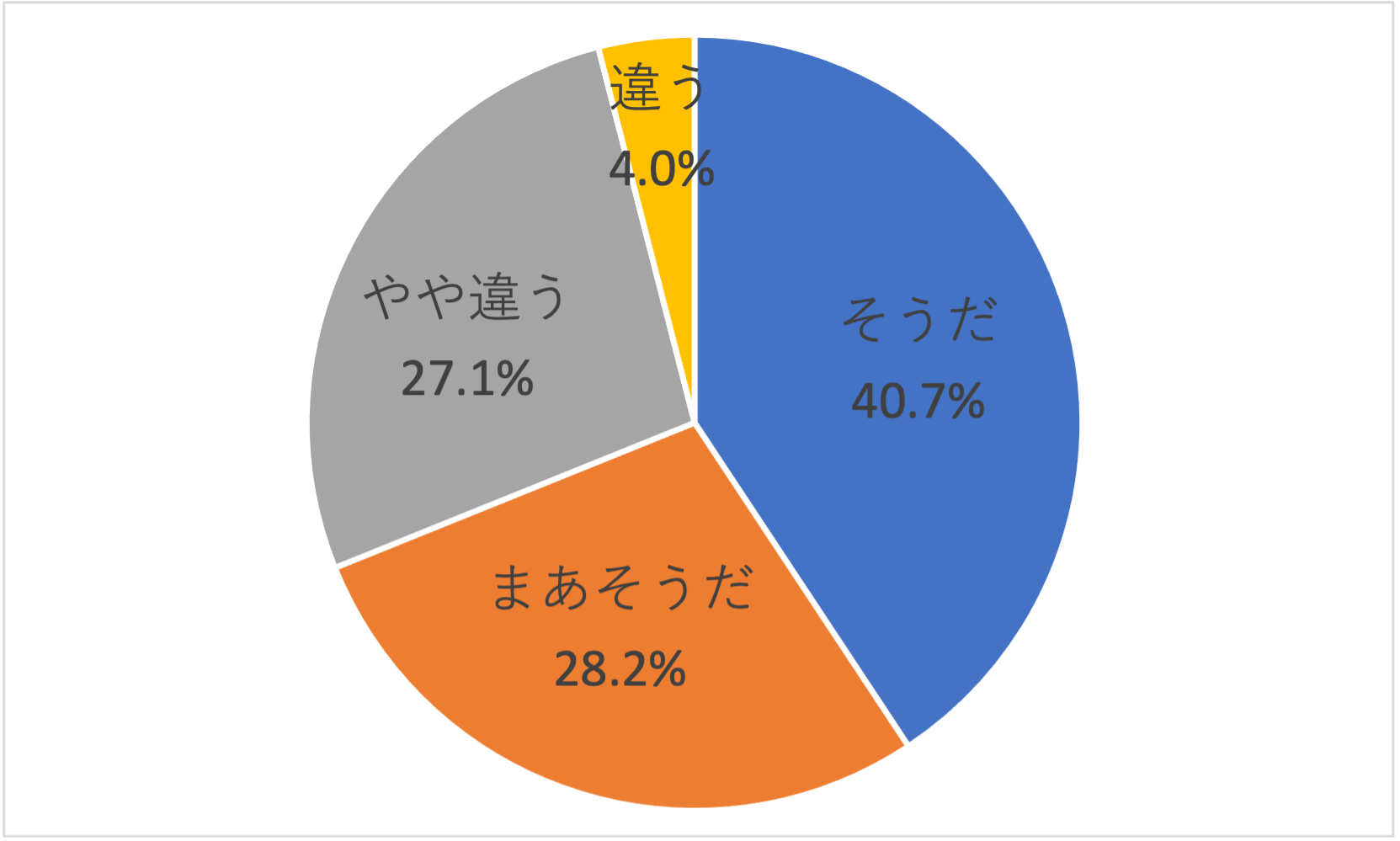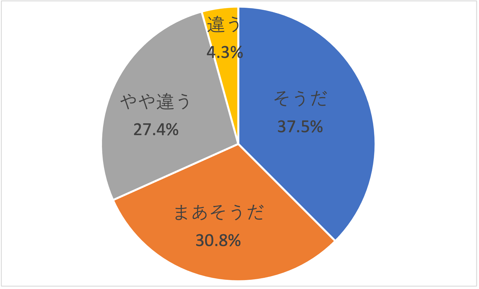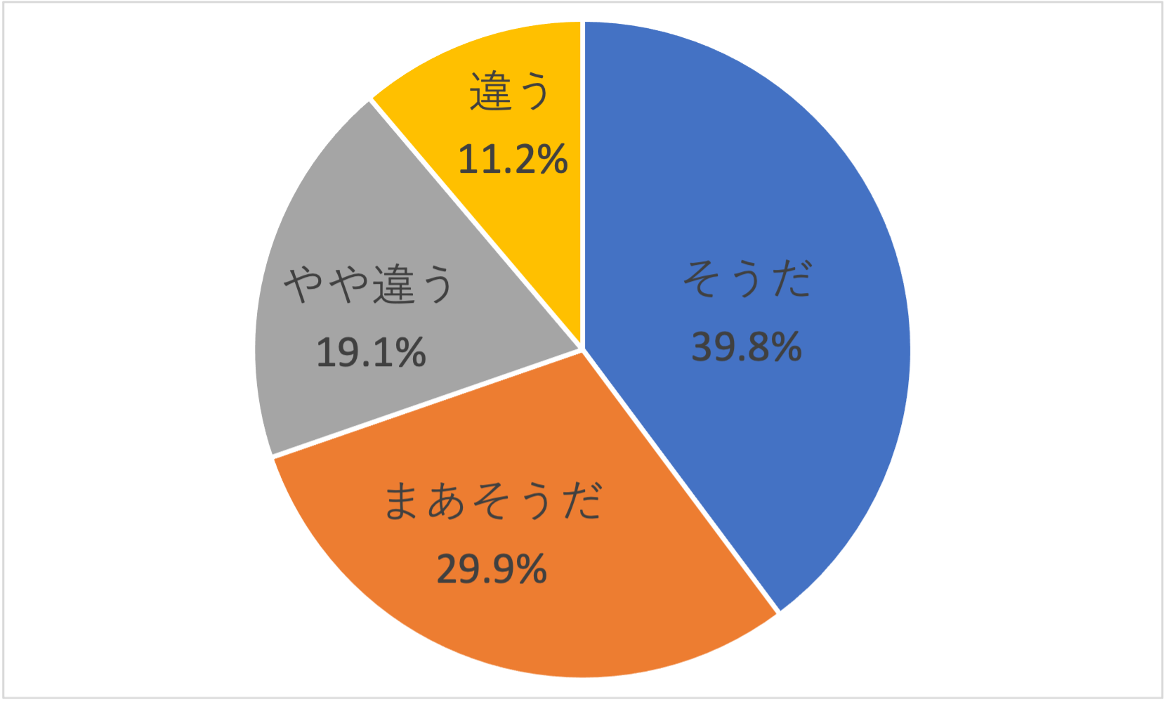 回答者のうち、『そうだ』が39.8%、『まあそうだ』が29.9%という結果で、合計69.7%の方が職場の人間関係は良好だと回答しました。先の質問で「職場に意見が合わない人がいる」方が77.8%も存在している一方で、全体的な職場の人間関係が良好だと考える人の割合が多いようです。