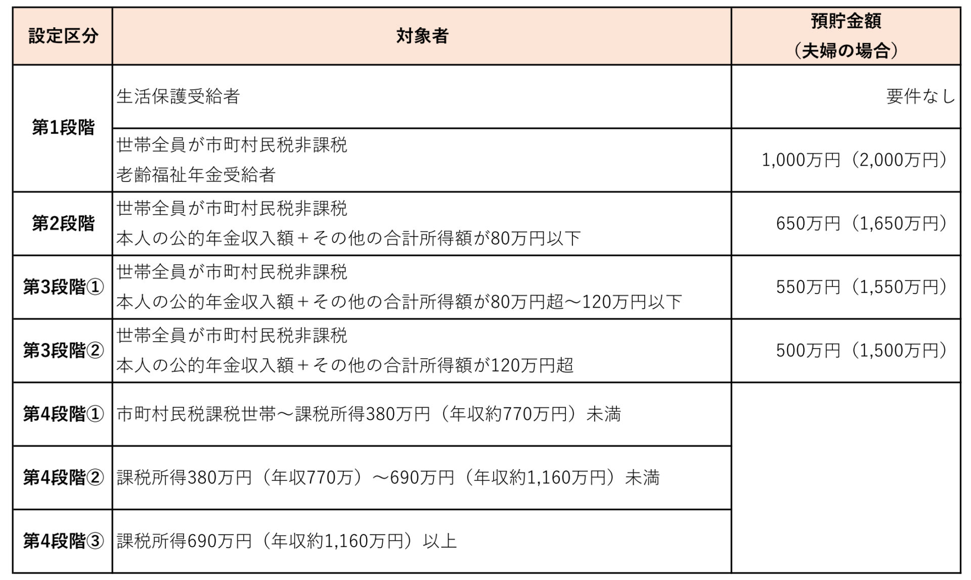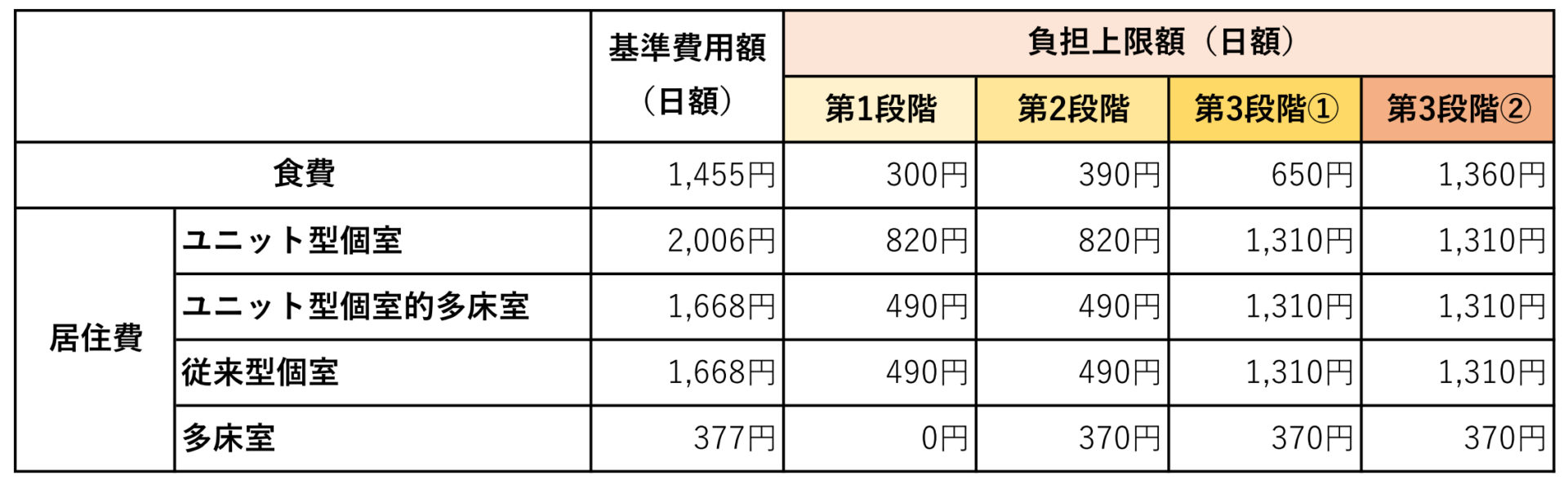 入所者の所得や預貯金額によって、認定区分が第1段階~第4段階に分類されます。この認定区分をもとに、居住費と食費の負担上限日額を確認しましょう。