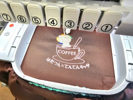 てんてんのイラストをもとに、職員さんがデータを微調整し、利用者の皆さんが刺繍作業に取り組んでいました。
