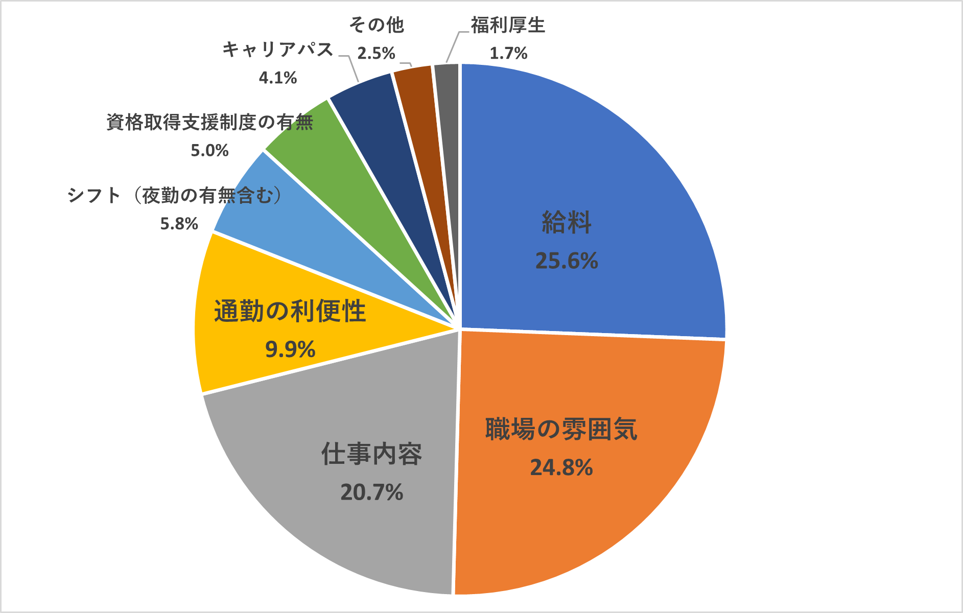 給料という回答が最も多く、回答者の内25.6%の方が選択していました。2番目に多かった職場の雰囲気という回答も24.8%となっており、回答者の約半数がどちらかを最重視している結果になりました。