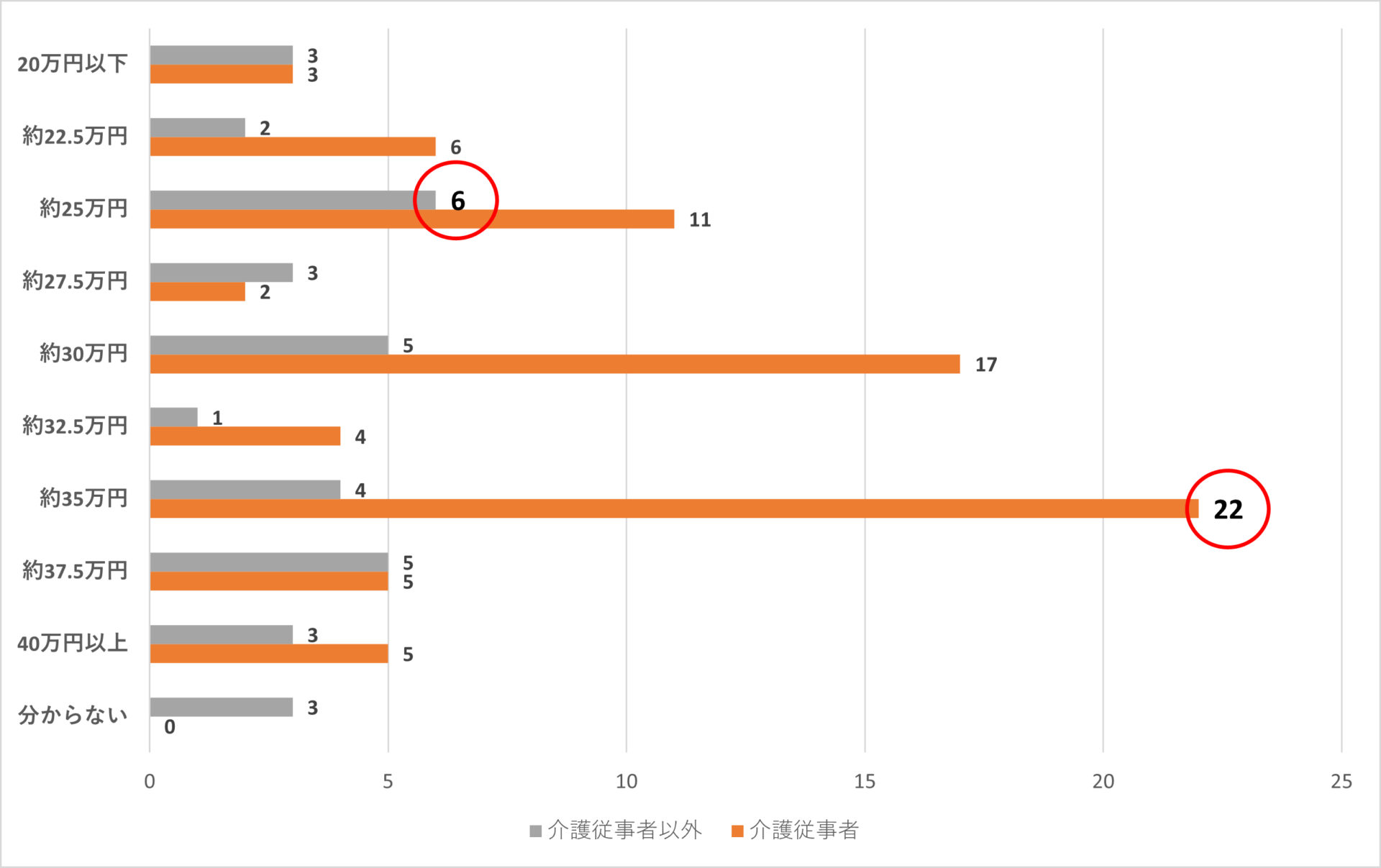 介護従事者の回答で最も多かったのが約35万円、介護従事者以外の回答で最も多かったのは約25万円という金額でした。